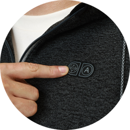 The dual-control system allows you to separately manage the heating zones. One control button (ororo logo) adjusts the heat for the chest and back zones, while the other button (A) controls the left & right arms. This feature lets you customize warmth where you need it most, helping to extend battery life by selectively heating areas based on your needs.